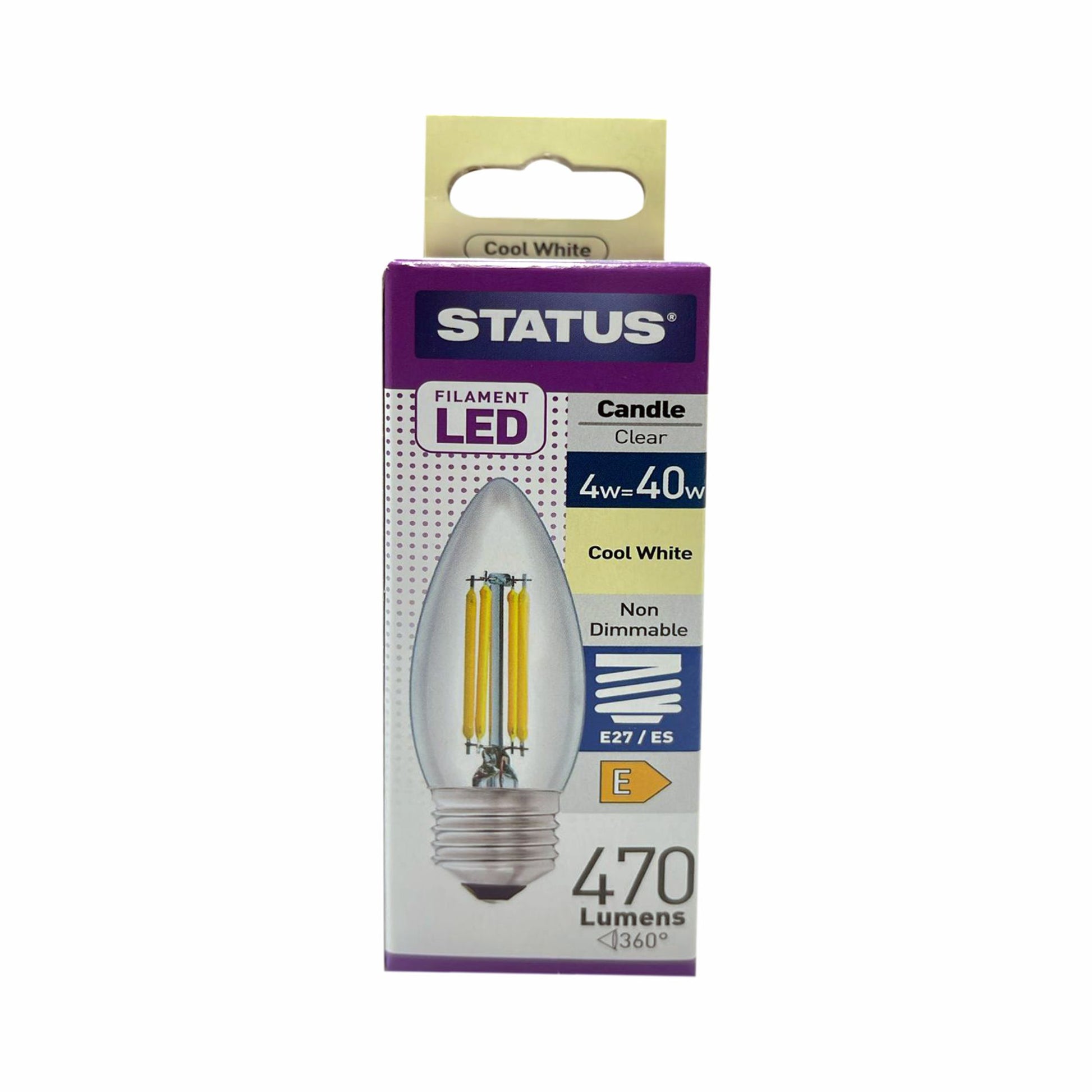 Clear Filament LED Candle Lightbulb, Long-lasting and Cost-effective 4W Power Output, Equivalent to a 40W Incandescent Bulb; 470 Lumens Cool White Light, Perfect for Chandeliers, Decorative Lamps, and Light Displays E27 (ES) Large Edison Screw Base 25,000-hour Lifespan; 12,500 On/Off Cycles; Non-Dimmable